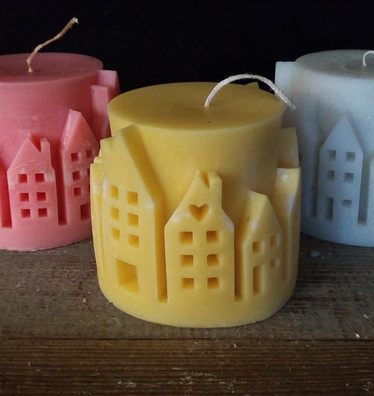 Een dorpje op een cilinderkaars, in verschillende kleuren.
