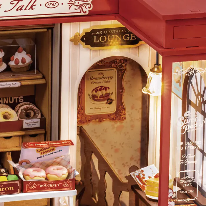 Stap binnen in deze vintage winkel vol zoete lekkernijen! Achterin vind je een indrukwekkende antieke kast in bruinrood, terwijl de opdruk op de ramen zorgt voor een nostalgische sfeer. Voorin de winkel staat een vitrine vol heerlijke gebakjes en donuts, klaar om van te smullen. Rechts kun je naar de lounge om rustig te genieten van je zoete dessert. Dit houten bouwpakket voor volwassenen bevat ook een doorzichtige kunststof bonbonnière, perfect voor het presenteren van je eigen lekkernijen. Creëer een charmante, sfeervolle winkel in miniatuur met dit prachtige pakket!